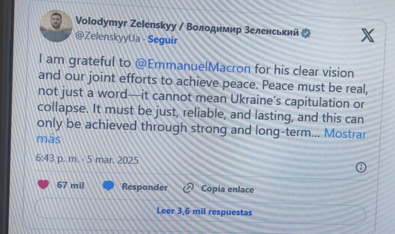 El Presidente ucraniano, Volodímir Zelenski, expresó su agradecimiento al mandatario francés, Emmanuel Macron, por su contundente discurso en el que subrayó la necesidad de que Europa se fortalezca y dependa de sí misma para defenderse de amenazas como la de Rusia. Zelenski destacó la claridad de la visión de Macron y sus esfuerzos conjuntos para lograr una paz duradera en Ucrania. A través de un mensaje en la red social X, Zelenski declaró: «Le estoy agradecido a Emmanuel Macron por su visión clara y sus esfuerzos conjuntos para lograr la paz». En ese mismo mensaje, el presidente ucraniano insistió en que la paz que se logre debe ser «real», y enfatizó que cualquier acuerdo no puede implicar la «capitulación» de Ucrania.