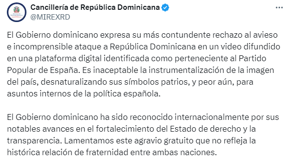 El Gobierno de la República Dominicana ha expresado su firme rechazo a un video que fue difundido en una plataforma digital vinculada al Partido Popular (PP) de España. En el material audiovisual, se desnaturalizan y ridiculizan los símbolos patrios dominicanos, lo que ha sido considerado por las autoridades como un acto de instrumentalización política inadmisible.