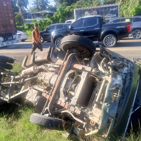 El accidente ocurrió en el sector Arroyo Palma, donde se puede observar la devastadora escena del choque: varios cuerpos tendidos en el suelo, mientras el vehículo militar quedó prácticamente destruido, volcando y cayendo en las zanjas que separan las vías de la autopista.