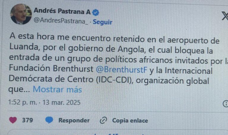 El expresidente de Colombia Andrés Pastrana denuncia haber sido retenido en el aeropuerto de Luanda, Angola
