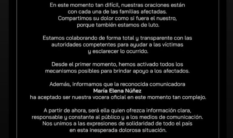Nos complace informar que la reconocida comunicadora María Elena Núñez ha aceptado ser nuestra vocera oficial en este complejo contexto. A partir de ahora, ella será quien ofrecerá información clara, responsable y constante al público y a los medios de comunicación.