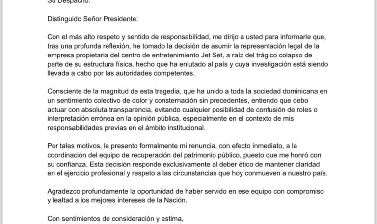 El abogado Jorge Luis Polanco presentó este martes su renuncia inmediata a la coordinación del Equipo de Recuperación del Patrimonio Público, cargo que desempeñaba por designación del presidente Luis Abinader. La decisión responde a su nueva responsabilidad como representante legal de la empresa propietaria del centro de entretenimiento Jet Set, escenario de una tragedia que ha consternado al país.