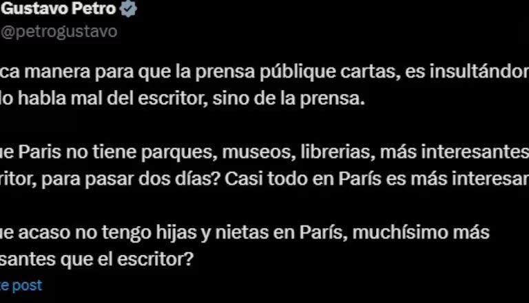 Petro, en su publicación, rechazó de manera tajante las acusaciones y, además, arremetió contra los medios de comunicación, a quienes acusó de dar relevancia a una carta que, en su opinión, carece de sustancia. «La única manera para que la prensa publique cartas, es insultándome. No solo habla mal del escritor, sino de la prensa», escribió el mandatario, sugiriendo que los medios están perdiendo el rumbo al centrarse en temas superficiales.