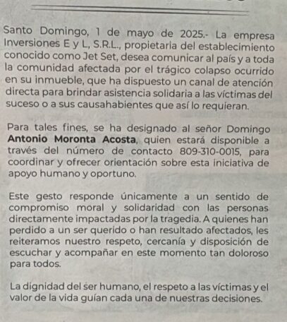 La empresa Inversiones E y L, S.R.L., propietaria del establecimiento Jet Set, anunció este jueves la creación de un canal de atención directa para brindar apoyo a las personas afectadas por el colapso ocurrido recientemente en sus instalaciones.