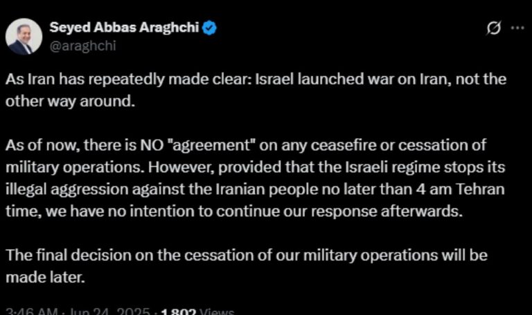 El ministro de Exteriores de Irán, Abás Araqchí, aseguró este martes que «no hay un acuerdo sobre un alto el fuego ni un cese de operaciones» con Israel pero afirmó que si Israel pone fin a su «agresión ilegal» contra Irán antes de las 4:00 de la madruada en hora local, Irán también pausará sus ataques.