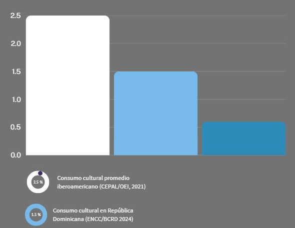 Se ha dicho que el consumo cultural del país representa un 1,5% del PIB –por debajo del promedio iberoamericano (2,3%) (CEPAL/OEI, 2021)–, sin embargo, al desagregar el gasto de los hogares, se advierte que el 63% del mismo se destina a suscripciones y contenido digital (ENCC/BCRD 2024), de modo que este consumo nada aporta a la industria cultural local. El Banco Central no analiza el gasto de los turistas en el sector cultura, y es comprensible, puesto que existe una barrera legal e institucional que dificulta la conexión de la oferta cultural con el sector turismo.