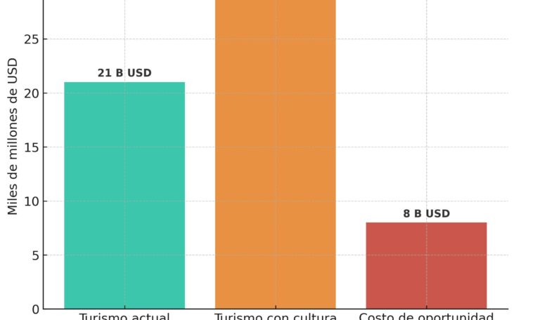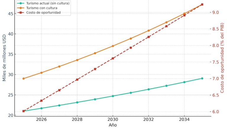 Para este 2025 se proyecta que el sector turismo aportará más 21 mil millones de dólares al PIB, equivalentes al 15.8% de la economía nacional (WTTC/Oxford). Dicho esto, el costo de oportunidad estimado por no integrar la cultura de forma estratégica al turismo podría ser de más de 8 mil millones de dólares anuales, equivalentes a cerca del 6% del PIB.