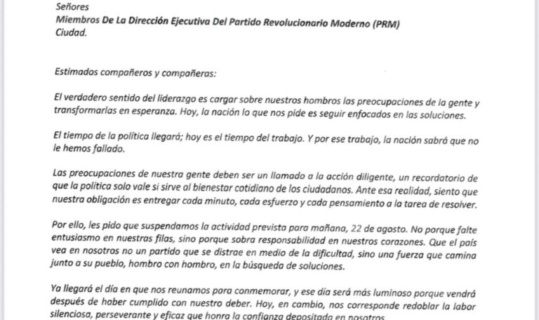 El presidente Luis Abinader envió este jueves 21 de agosto una carta a la Dirección Ejecutiva del Partido Revolucionario Moderno (PRM) en la que solicitó la suspensión de la actividad política programada para el viernes 22 de agosto, priorizando el trabajo por las necesidades de la población.